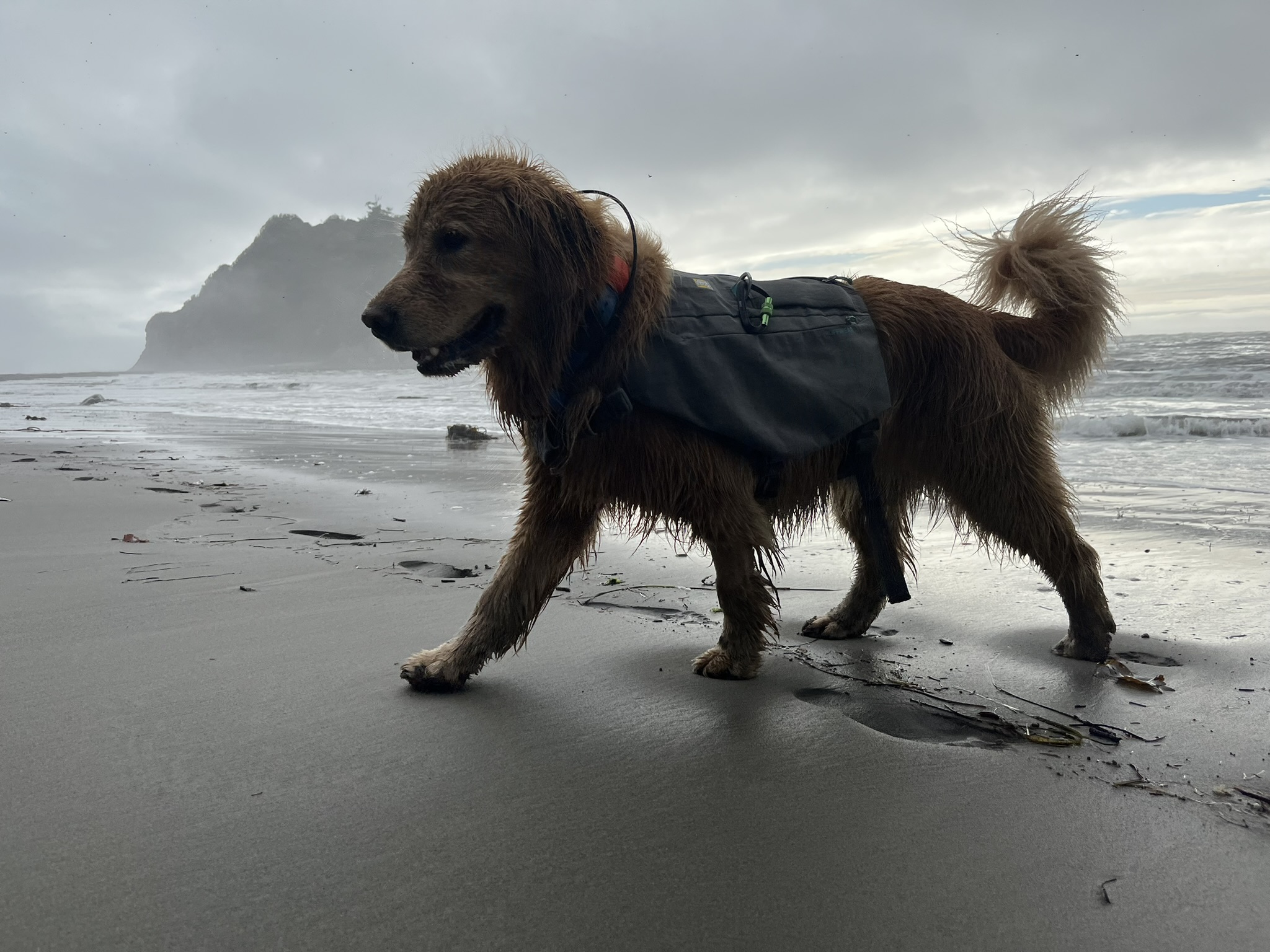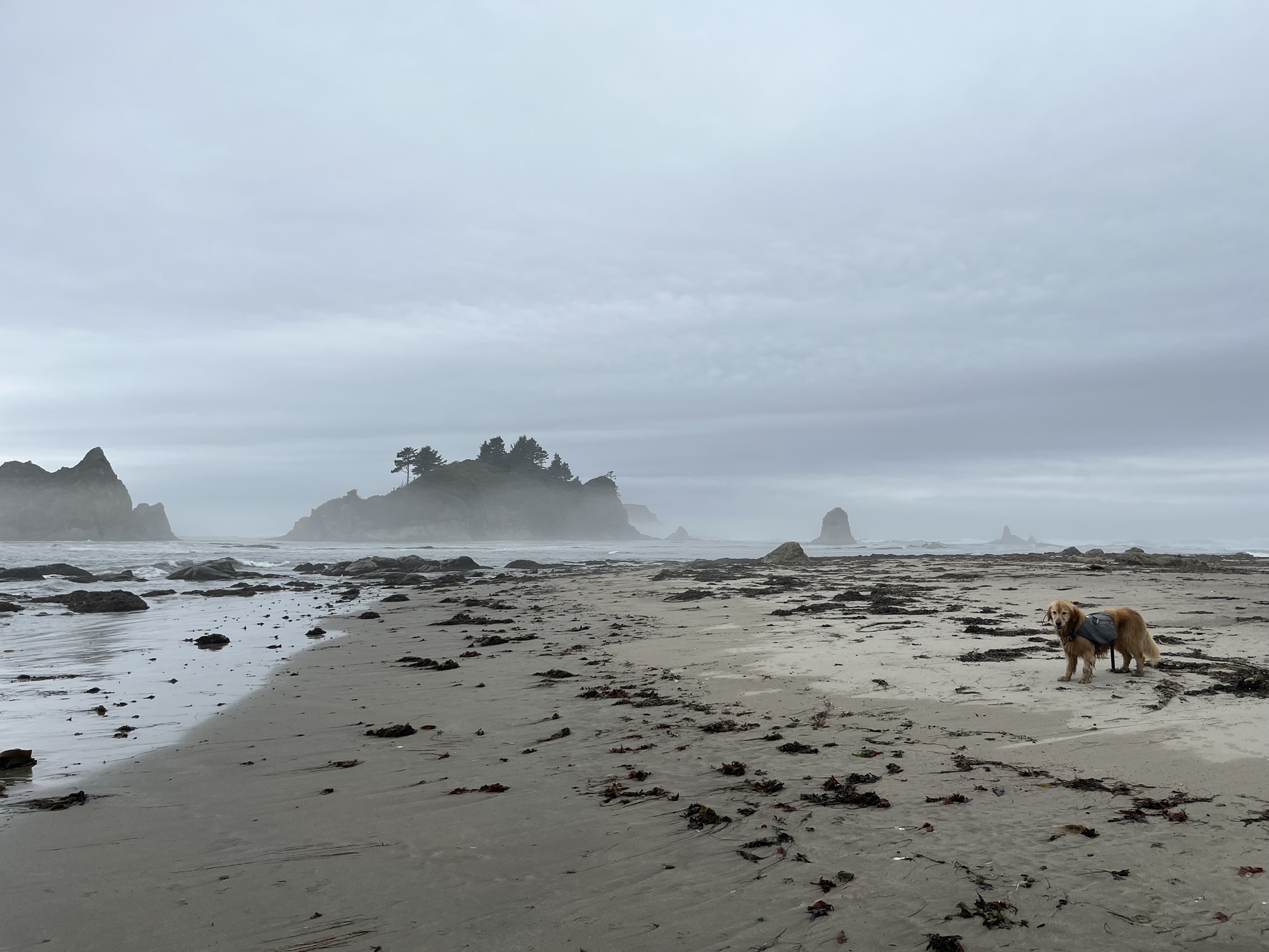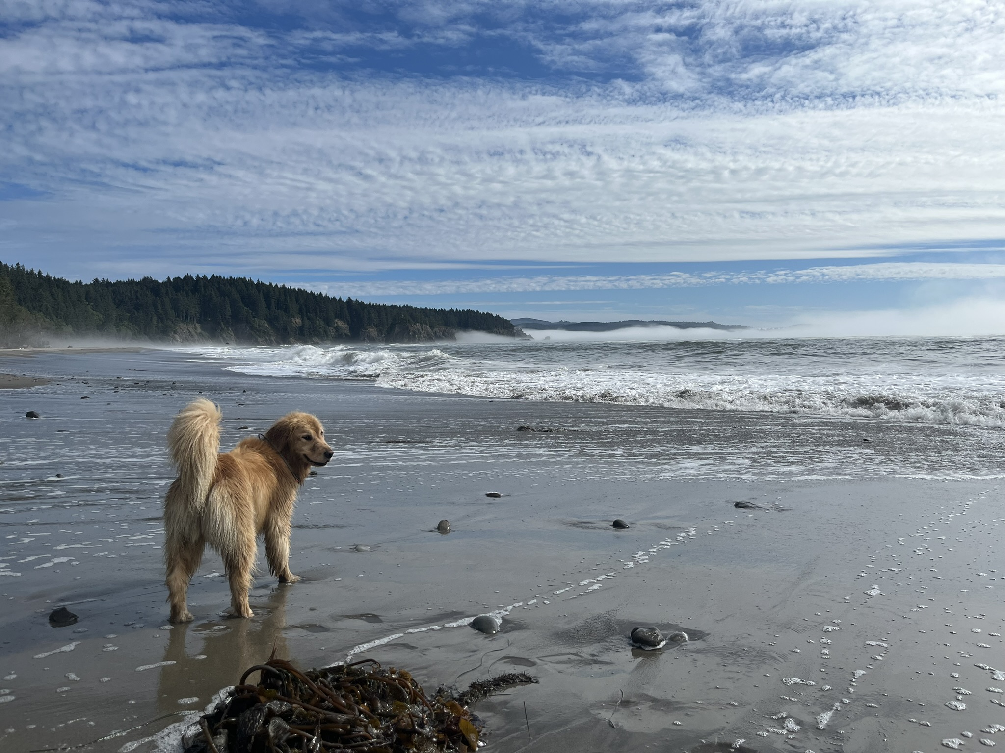 By early afternoon the fog burned off and the coast opened up. Blue sky. Big surf. Views that went on for miles. I stood at the waterline watching waves roll in, kelp tangled at my feet, forested headlands fading into sea mist to the north. The sun was warm on my back and the water was cold on my paws and this was the best place I had ever been.