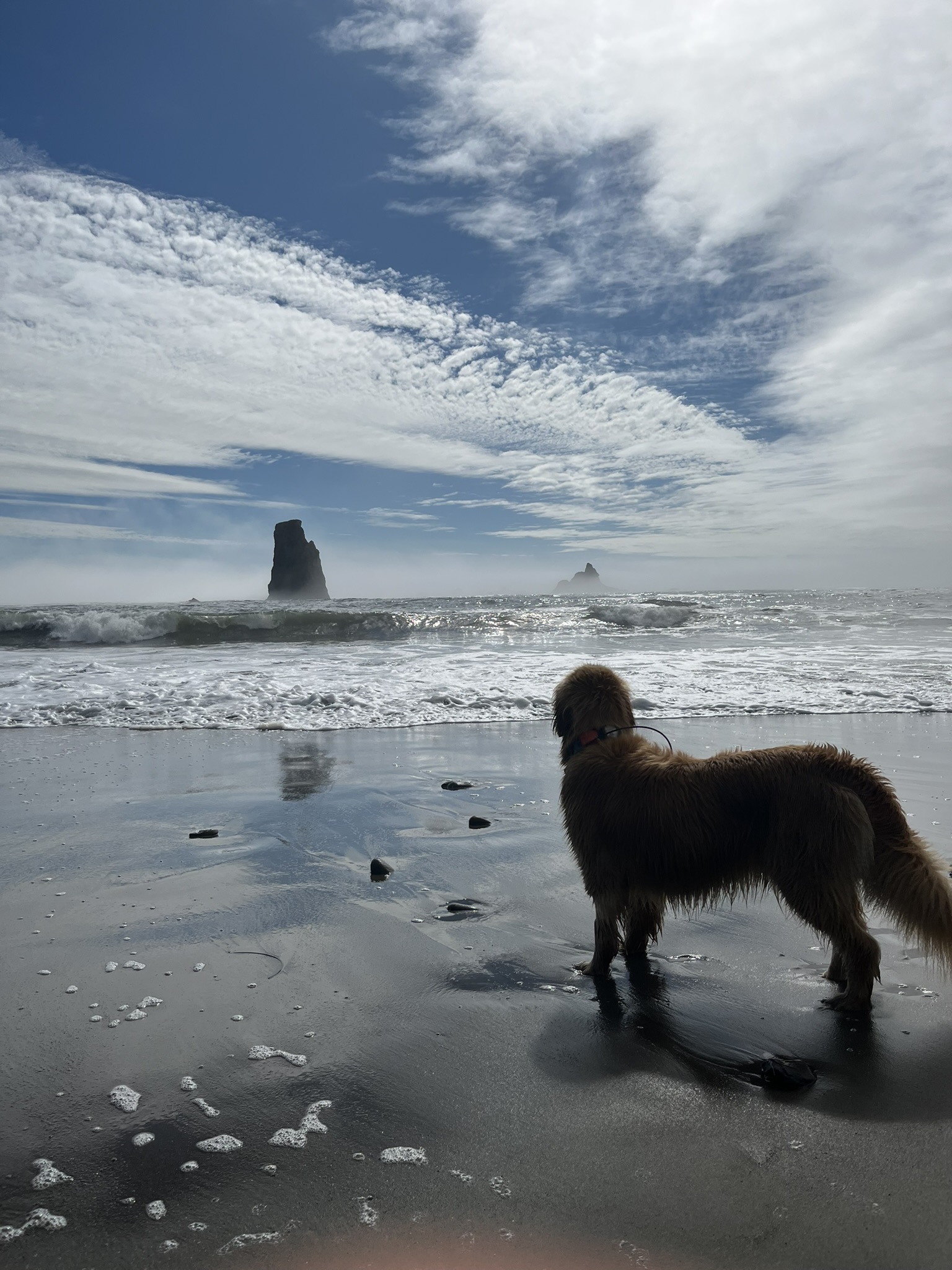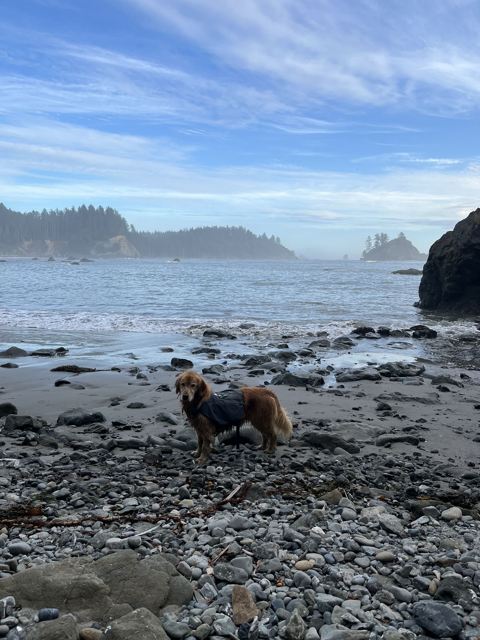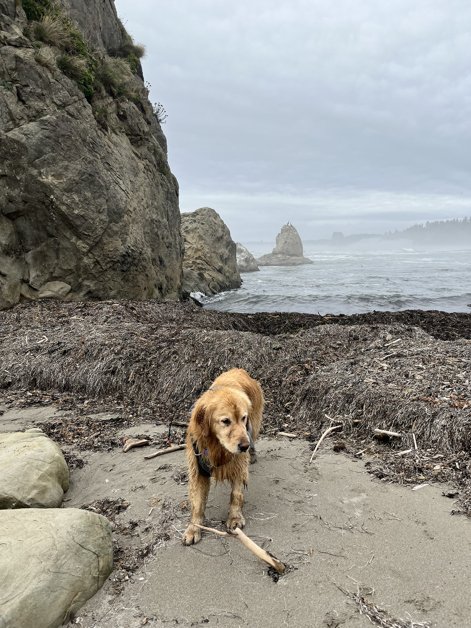 By early afternoon the fog burned off and the coast opened up. Blue sky. Big surf. Views that went on for miles. I stood at the waterline watching waves roll in, kelp tangled at my feet, forested headlands fading into sea mist to the north. The sun was warm on my back and the water was cold on my paws and this was the best place I had ever been.