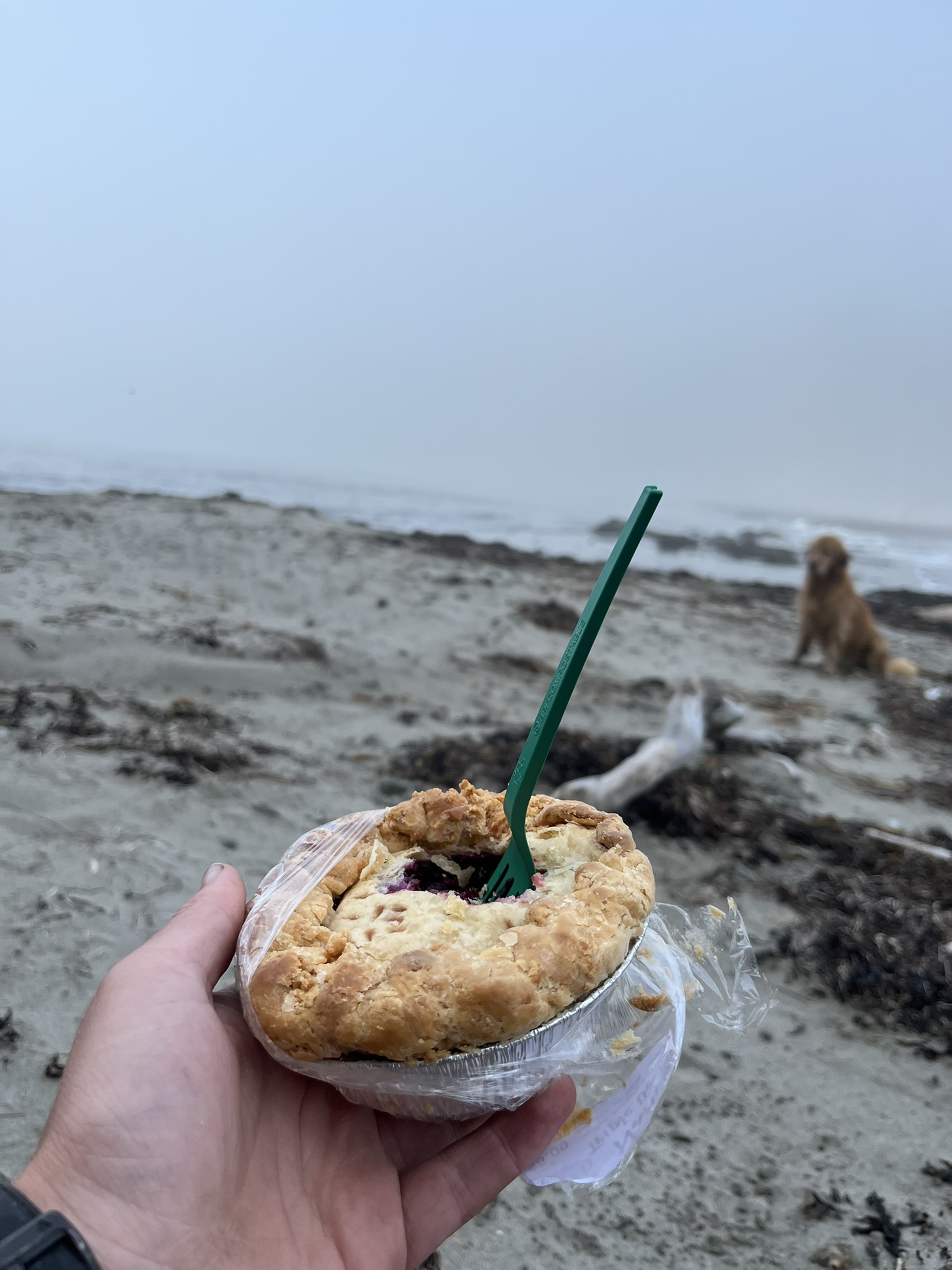 Around 4 PM, somewhere between headlands on a foggy beach, my human stopped and pulled out a miniature berry pie. Packed in from town. He ate it with a plastic fork while I sat in the sand nearby. I was not interested. I was looking at the ocean. I was definitely not watching every single bite.