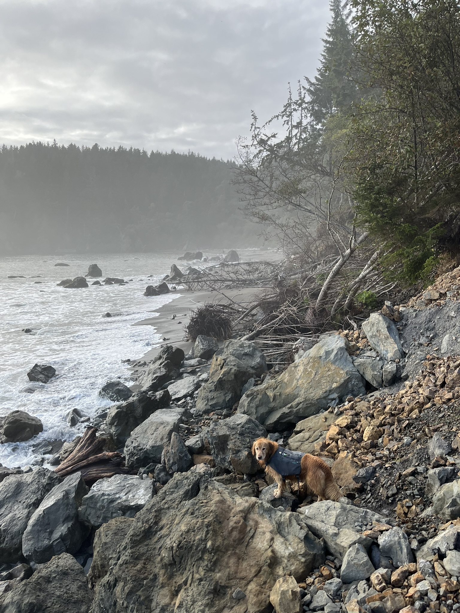 I scrambled across boulders at the base of the headland, waves crashing just below my paws. The forest pressed down from above and the ocean pressed in from below, leaving a narrow band of rock to navigate. I could taste the spray on my lips. This is the section that turns people back. Not us.
