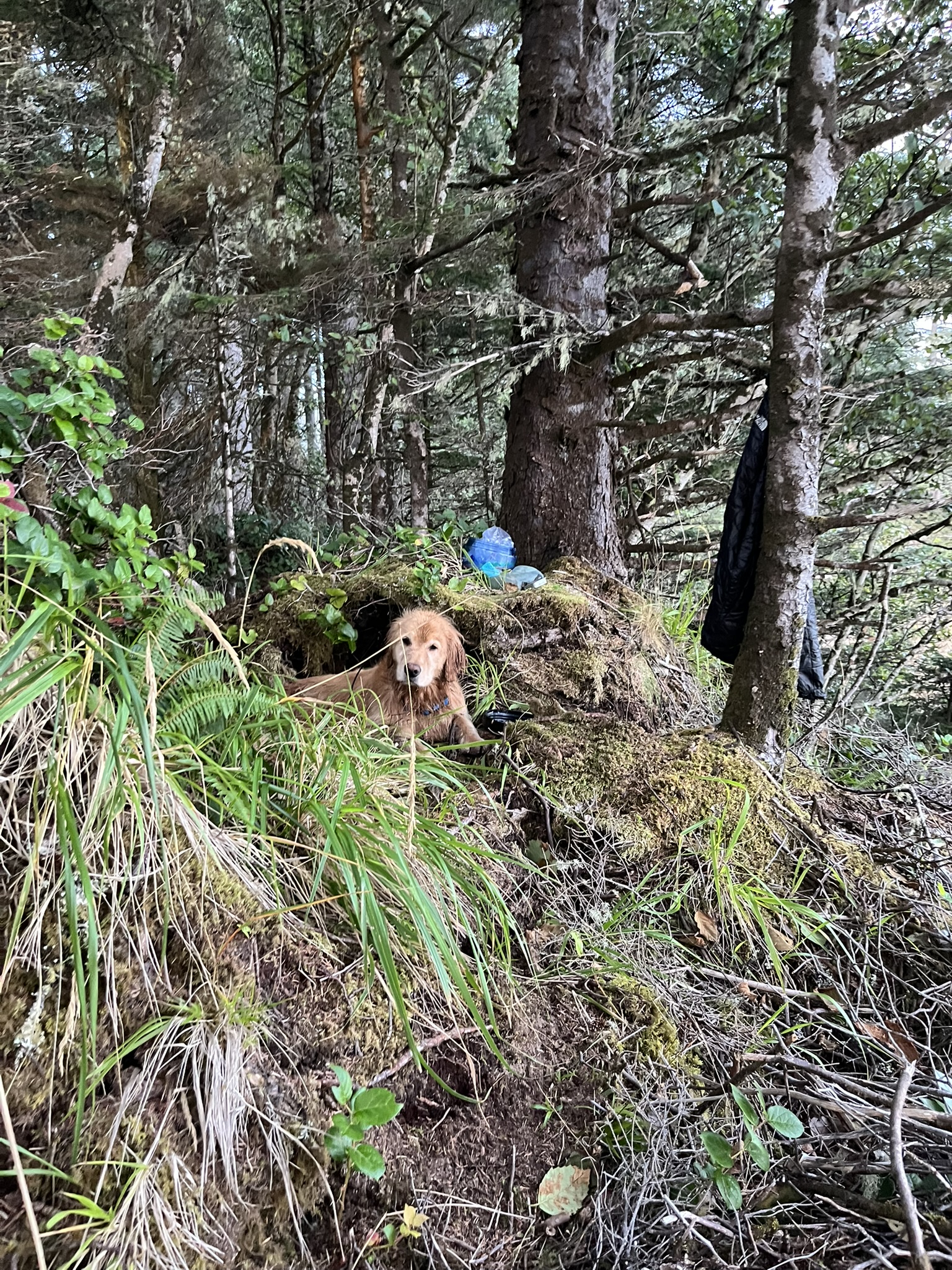 We set up camp right there on the headland, in the trees above the viewpoint. I found a mossy shelf between roots and settled in. The moss was cool and damp and smelled like centuries of slow growth. Gear hung from branches around me.
