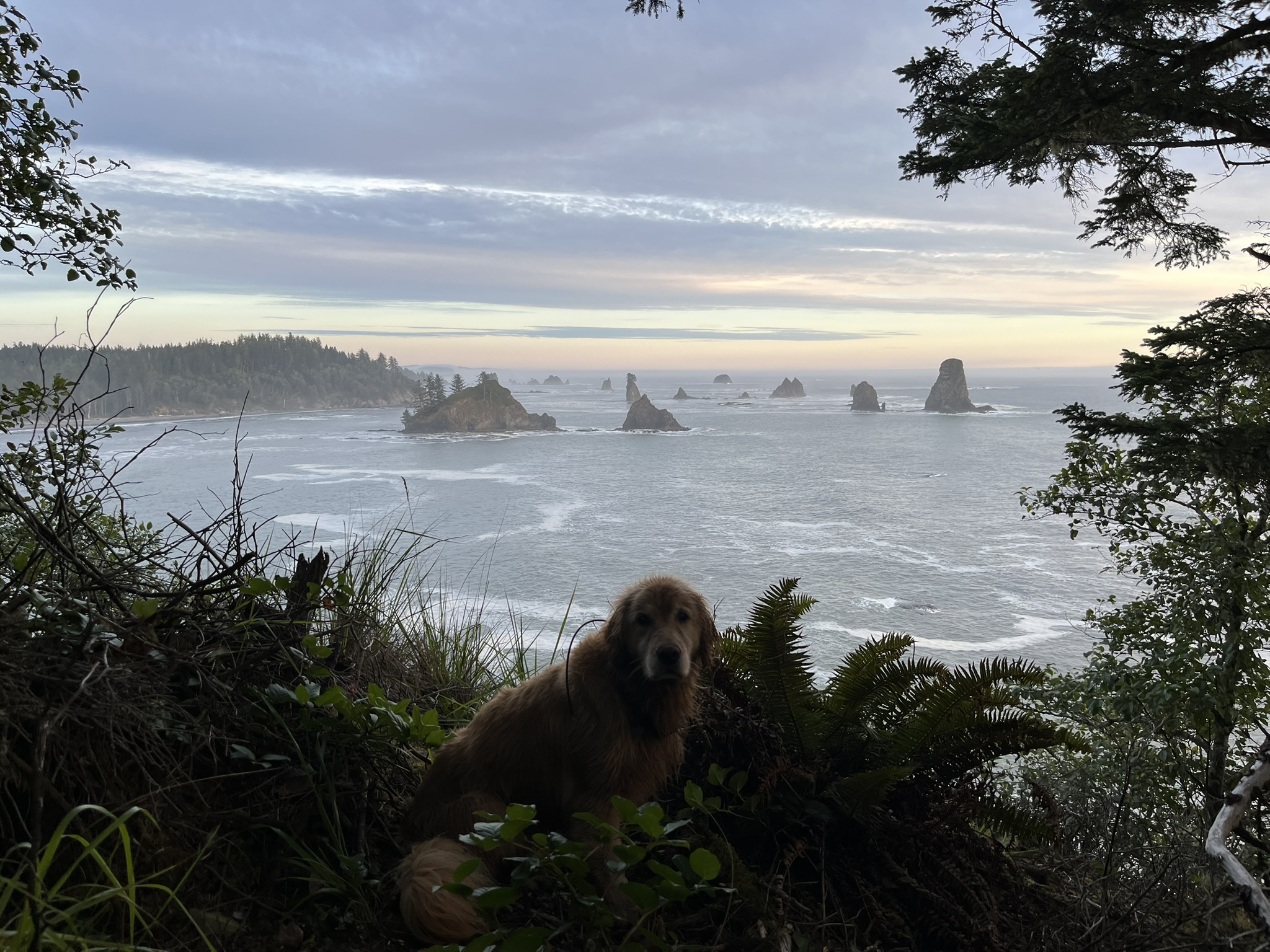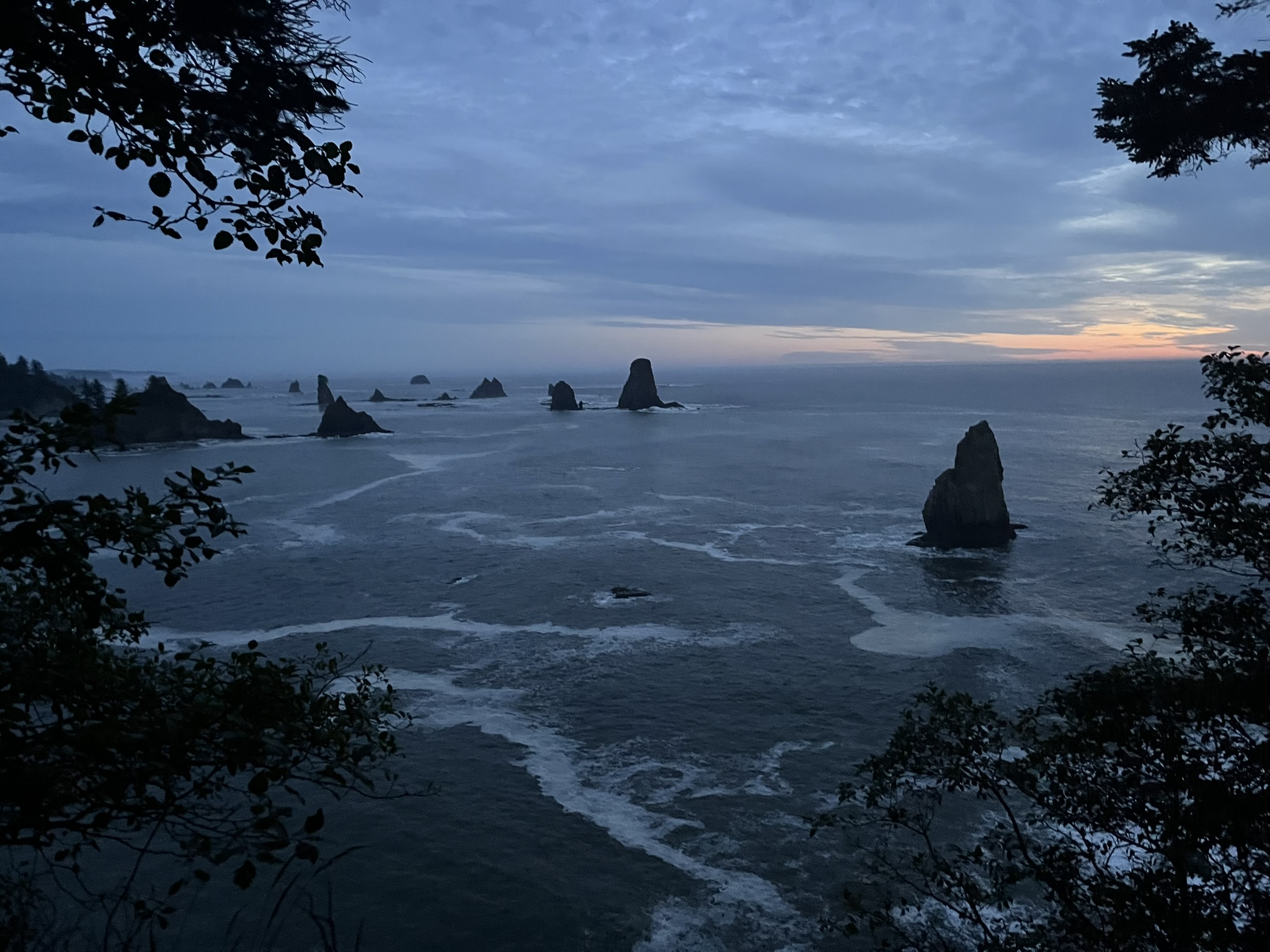 I sat at the edge of the trees with the entire sea stack panorama behind me — ocean, spires, sunset light, all of it spreading out below. The wind had died. The only sound was the surf, far below.