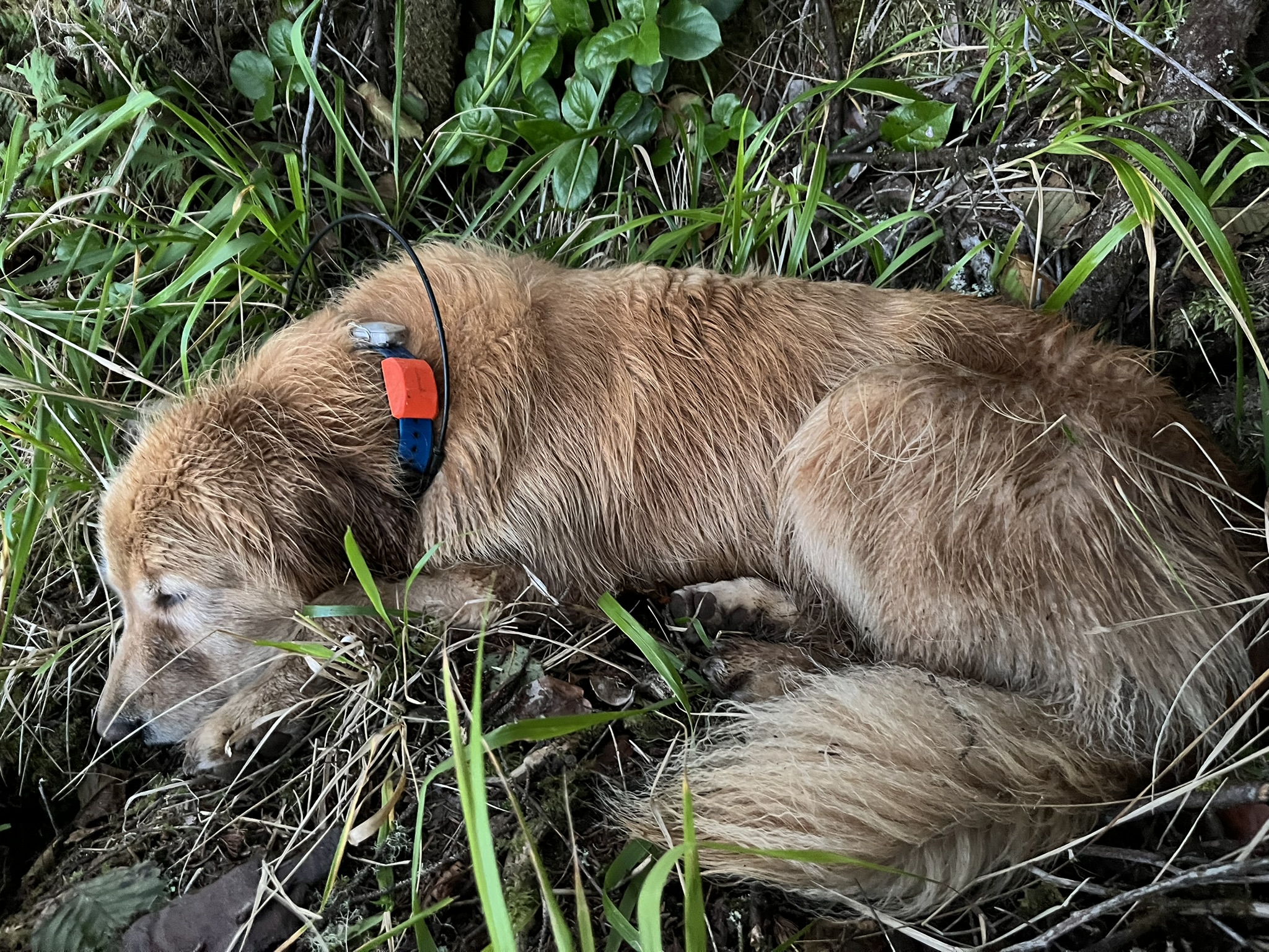 Then I was done. Two full days of coastal travel and I curled up in the grass at the base of a tree, my orange GPS collar still blinking, and fell asleep while the sun went down. My human sat next to me, not touching, just there. The grass smelled like earth and salt and I could hear the waves and him breathing and that was all I needed.