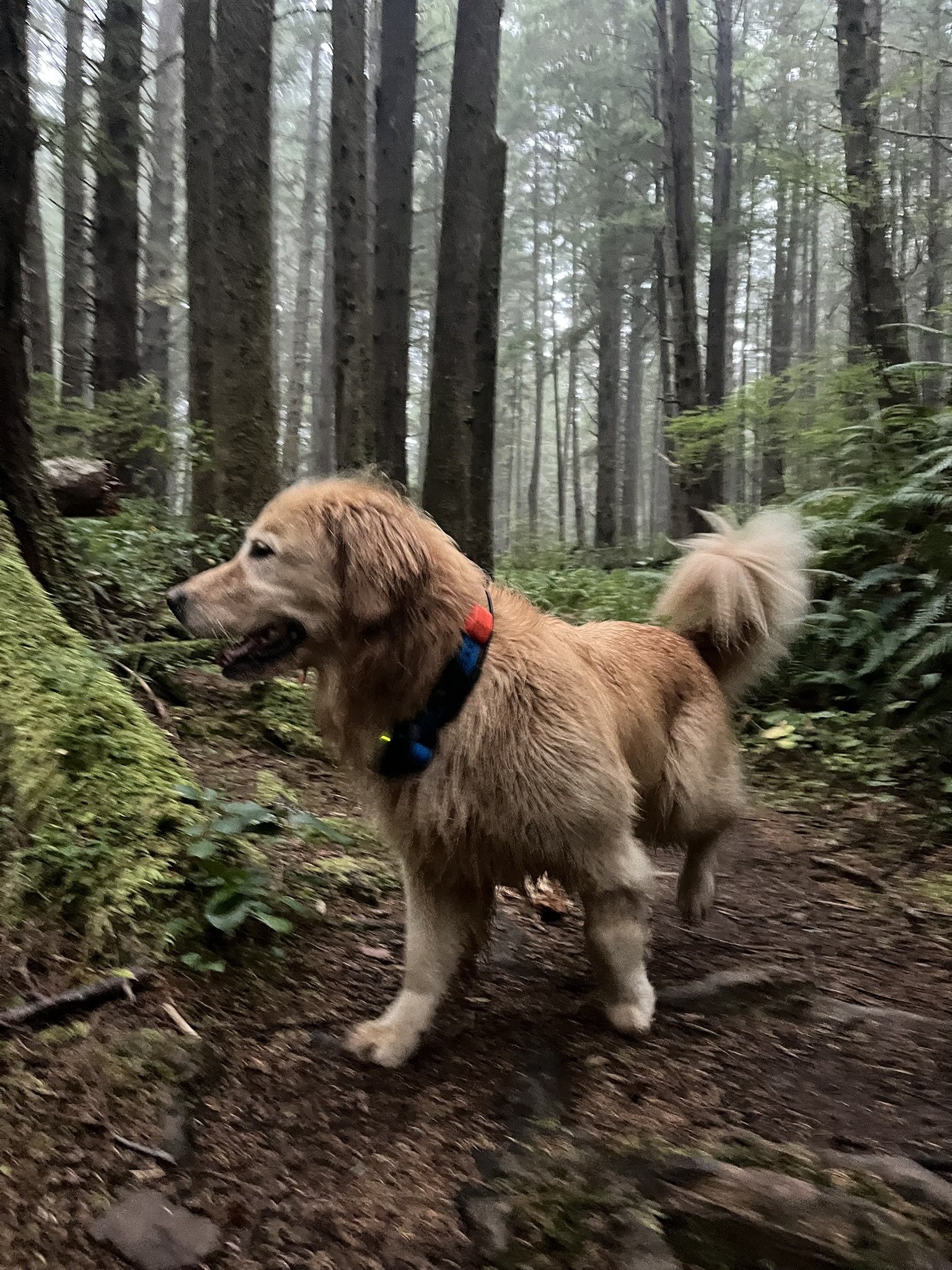 The path was all roots and mud, tunneled through old growth. Game paths through centuries of accumulated green. I could smell deer and elk and the faint musk of bear, all layered into the soil like pages of a book. I stopped at a particularly fresh scent — bear, strong enough to tighten my shoulders. I looked back at my human and he read me immediately. We waited. Listened. The forest gave us nothing but silence and the drip of fog from branches. Whatever had been here had moved on. We were visitors in its home, and I take that seriously. This forest has been here longer than anything I can comprehend.