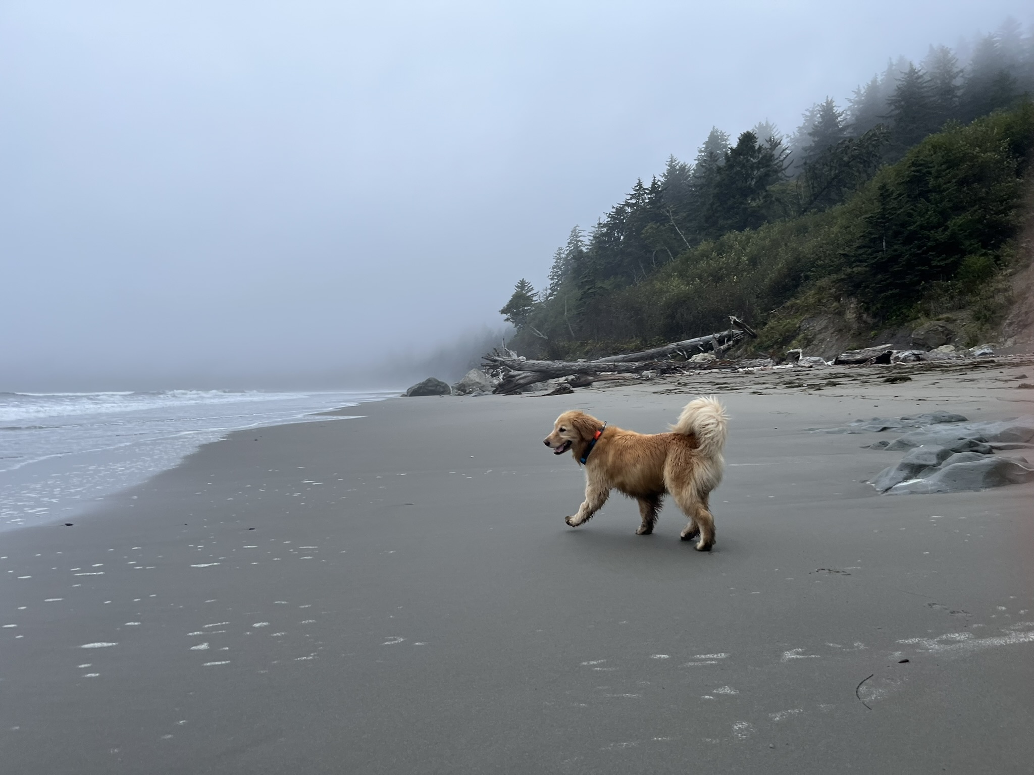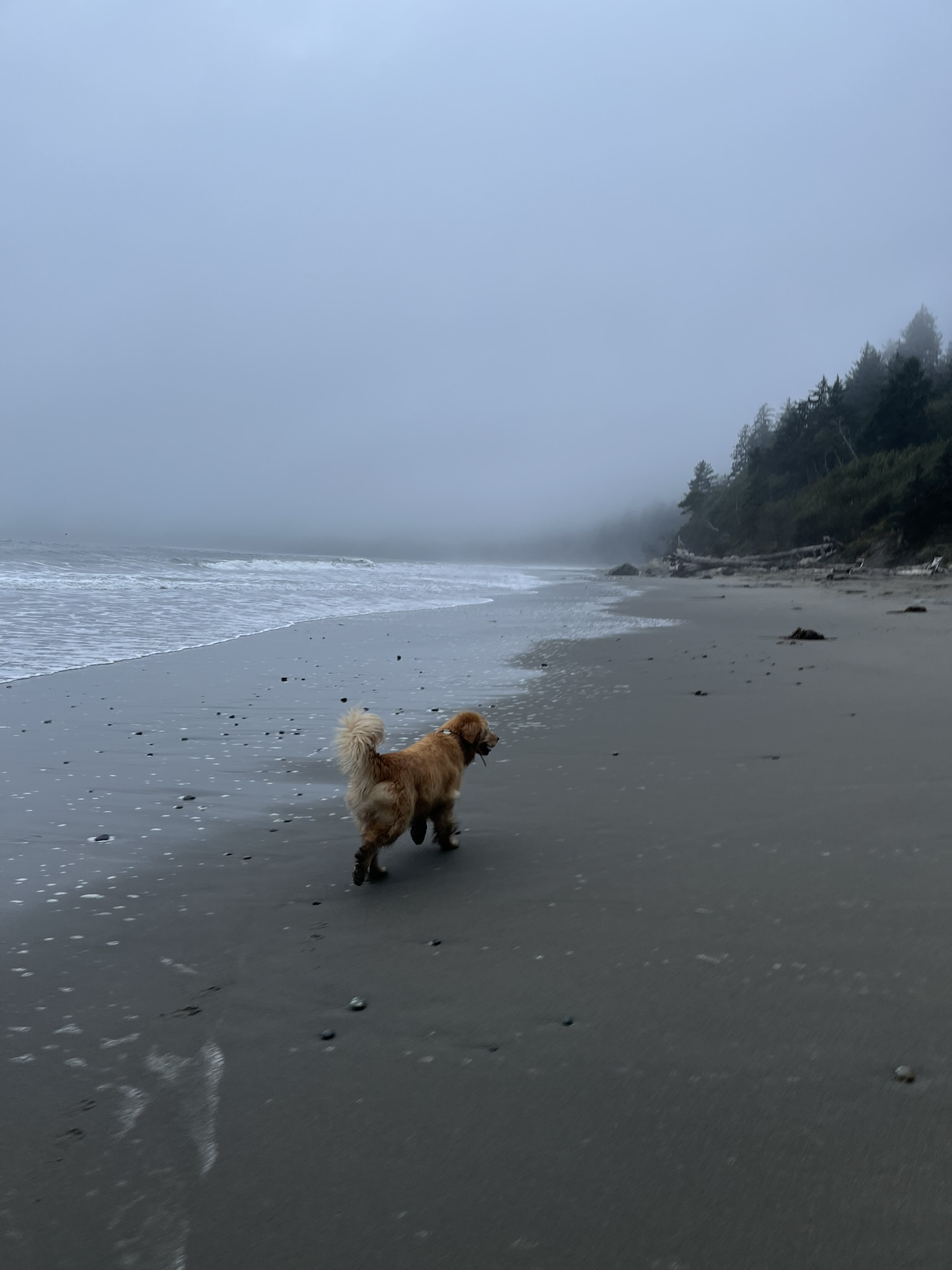 At the bottom: Third Beach. Foggy, wide, empty. I trotted ahead with my tail up, looking down the coastline into nothing. The sand was firm and cold and the fog muffled everything into silence.